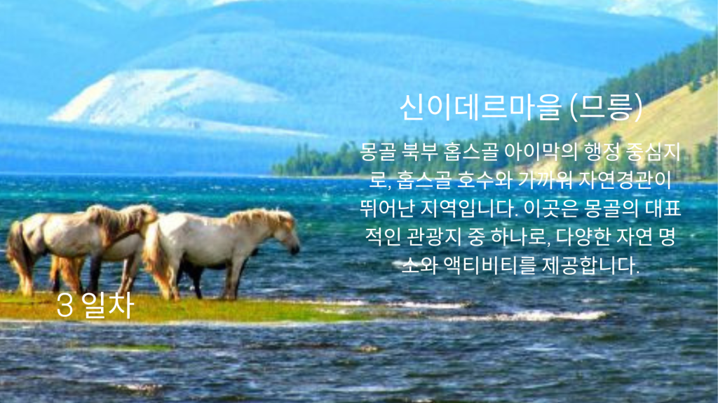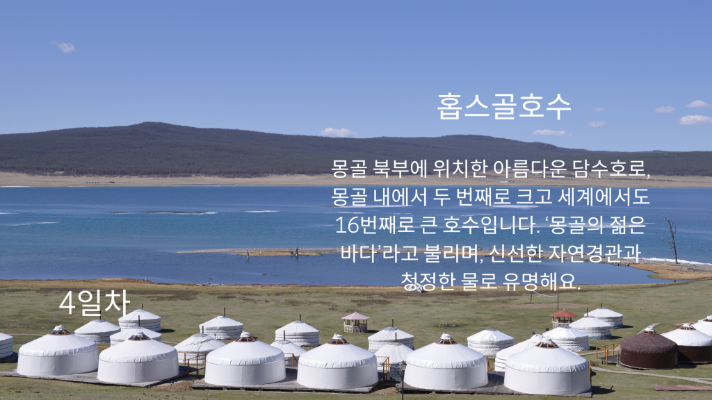 몽골 중부에서 북부까지 이어지는 대표적인 자연 치유 여행 코스로, 따뜻한 온천욕과 신비로운 화산지형, 몽골의 푸른 진주 ‘홉스골 호수’의 감동을 한 번에 경험할 수 있는 7일간의 여정입니다. 단순한 관광이 아닌, 몸과 마음을 위한 진정한 힐링을 원하신다면 이 코스가 정답입니다.