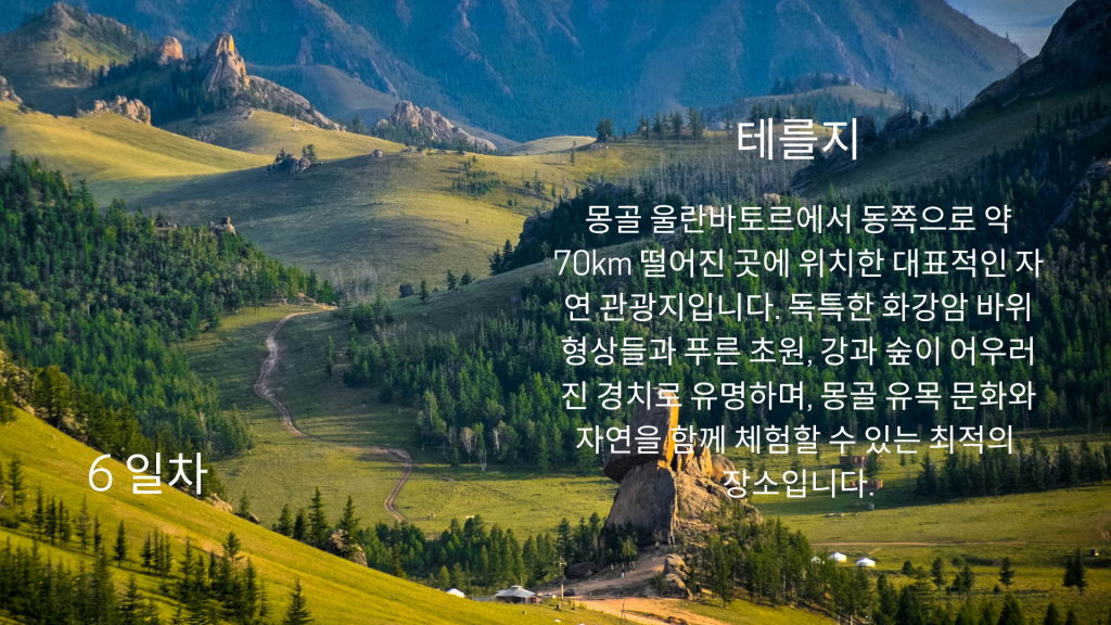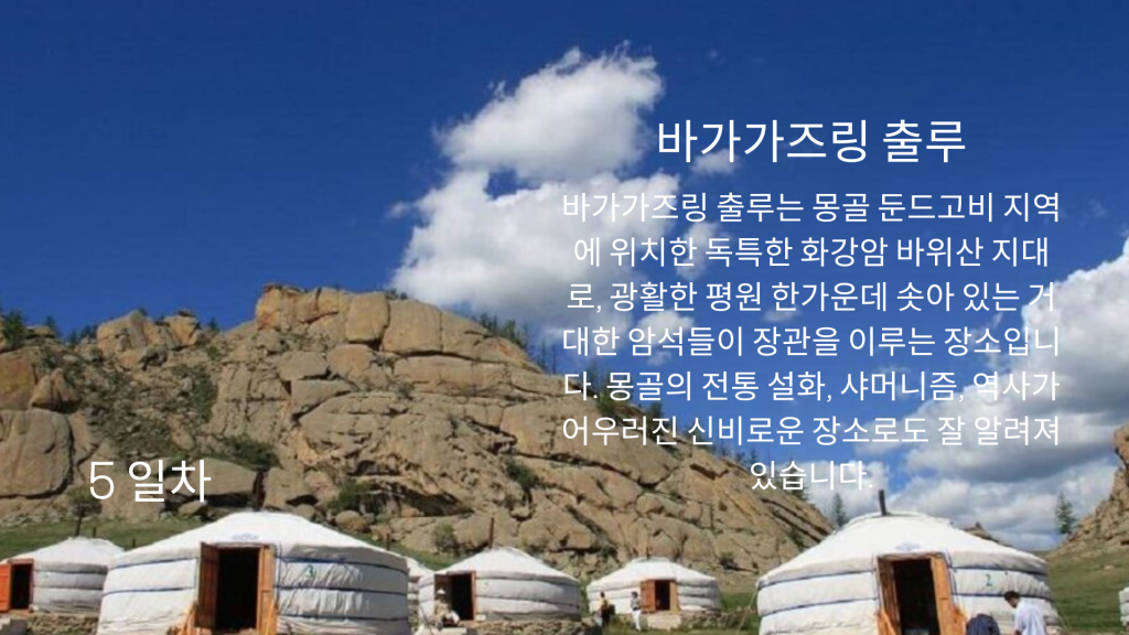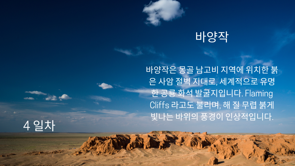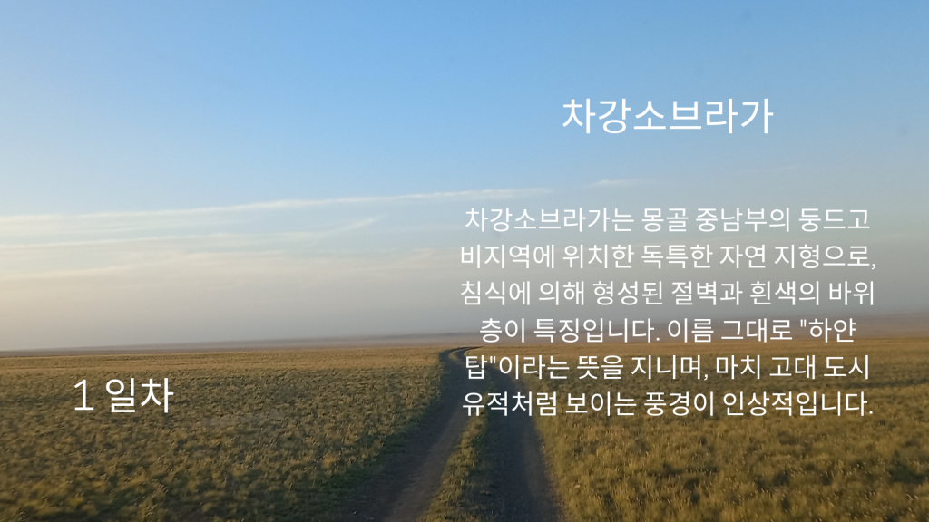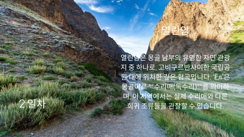 이 여행은 울란바토르에서 출발하여 몽골 남부 지역으로 향합니다. 첫 번째 주요 관광지는 수천 년간의 바람과 비에 침식되어 형성된 점토 절벽으로 구성된 차강소브라가입니다. 자연이 만들어낸 장엄한 예술을 감상하며 사진 촬영하기에 완벽한 장소입니다. 다음 목적지는 열린암입니다. 고비 사막의 산 속에 위치한 깊고 좁은 협곡으로, 여름에도 녹지 않는 얼음과 시원한 그늘의 바위 협곡을 따라 트레킹할 수 있습니다. 이 지역은 시원한 기후와 함께 몸과 감각을 모두 활용하는 흥미로운 탐험이 될 것입니다.
