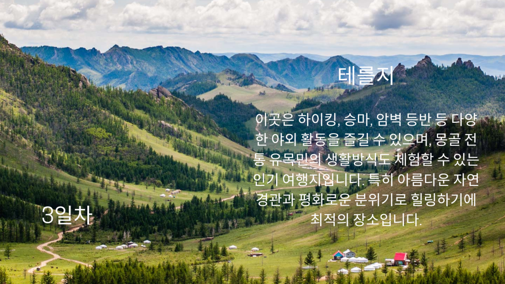 몽골의 청허르 온천에서 몸과 마음의 피로를 풀고, 미니 사막에서 독특한 사막 풍경과 낙타 체험을 즐겨보세요. 이어서 광활한 초원의 절경과 다양한 야생동물이 서식하는 테를지 국립공원에서 자연의 품에 안기며 평화로운 시간을 보내실 수 있습니다. 여행의 마지막은 몽골의 수도 울란바토르에서 몽골의 역사와 문화를 체험하며 마무리됩니다. 자연과 힐링, 그리고 몽골의 전통이 어우러진 특별한 4일 여행 코스입니다.